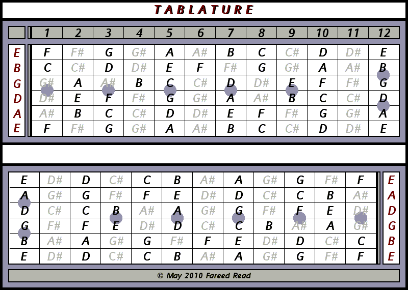 Apabila Anda menekan fretboard kesatu pada senar kesatu maka akan Anda peroleh naik setengah nada dari nada E yaitu F, Apabila menekan fretboard kedua pada senar kesatu maka akan Anda peroleh nada F#, dan seterusnya. karena setiap kali naik satu fret maka nada yang dihasilkan akan naik pula sebesar setengah nada.