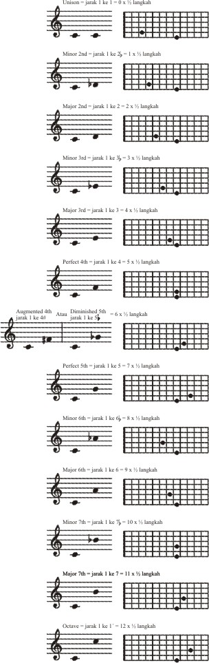 Gambar 2 menjelaskan kesuluruhan dari interval yang ada dengan menggunakan nama-nama interval yang umum digunakan dalam pengajaran musik. Interval-interval tsb ditulis dengan nada dasar C, kemudian di sebelahnya terdapat juga gambar diagram neck gitar untuk masing-masing interval tsb.